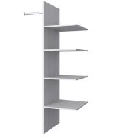 Конструктивно комплект полок OLIVIA 2DG поделен на два отделения. С левой стороны установлена одна горизонтальная планка. Справа на одинаковой высоте относительно друг друга расположены 4 полочки. Конструкция прочная и устойчивая. Ее можно применять в качестве заменяющего элемента и устанавливать на месте металлической штанги. Прежние секции пришли в негодность? Используйте этот набор для модернизации внутреннего пространства шкафа.