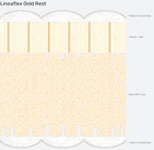 Высота матраса Голд рест – 21 см. Рекомендуемая нагрузка до 140 кг на одного человека. Жесткость относится к классу «средний». Комплектуется съемным классическим чехлом из натурального итальянского трикотажа, простеганного на 300 грамм файбера.